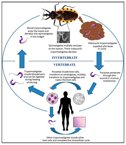 The life cycle of T. cruzi is well known (see [23]) and consists of several morphologically distinct developmental stages—the metacyclic trypomastigote, blood trypomastigote, amastigote, and epimastigote [24]. An overview is shown in Figure 4. When the metacyclic forms enter humans, proteins such as gp82 assist in Ca2+ mobilization, which facilitates cell invasion [25]. After approximately nine cycles of intracellular division, the parasites lyse the cell, invade other cells, and create nests of amastigotes in the host’s tissues. When parasites occur in the bloodstream, they can be absorbed by a triatomine during feeding and infect it for life. In the perimicrovillar membrane of the insect midgut, the parasites transform into epimastigotes and replicate by binary fission. They then migrate to the rectal ampulla, where they will become metacyclic trypomastigotes, which are expelled along with the feces and can infect another host to repeat the cycle [23]. In the rectum of the vector, T. cruzi glycoproteins play a key role in membrane attachment [26] and potentially in strain virulence.