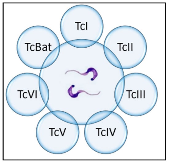 Subsequently, wide intragroup genetic heterogeneity was described within TcII, so it was subdivided into five subgroups: TcII a–e [56]. Subsequent scientific consensus and the use of new molecular tools then led to the decision to reclassify the parasite into seven discrete typing units (DTUs)—TcI–TcVI and Tcbat [57], which persists to this day (Figure 5). This classification is expected to advance knowledge of the population structure of T. cruzi, the evolution of the different groups, and the definition of epidemiological characteristics [58].