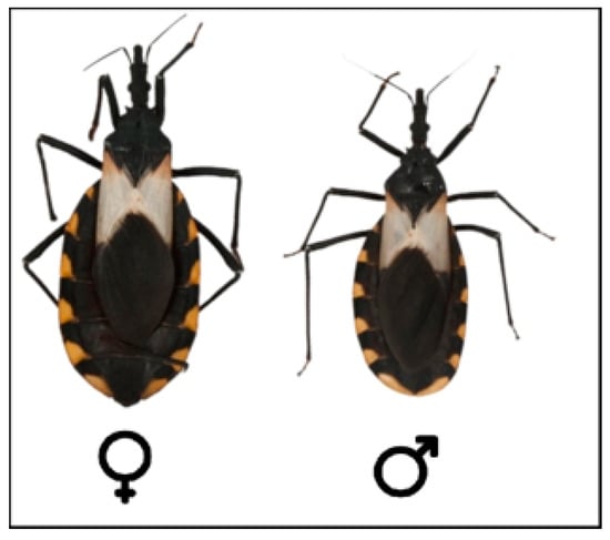 Triatomine development is hemimetabolous since the nymphs present similar biological characteristics to those of adults. The life cycle comprises an egg stage followed by five nymphal stages before reaching the adult stage. In adults, the sexes can be differentiated because the posterior border in males is continuous, while in females it is interrupted by the ovipositor apparatus (Figure 6) [63]. Triatomine species vary widely in size, ranging from 5 mm in Alberprosenia goyovargasi from Venezuela to 45 mm in Dipetalogaster maxima from Mexico [64]. The life cycle of triatomines and their phenotype in general can be altered by biotic and abiotic factors, including the presence of T. cruzi. However, the effects of the trypanosomatid seem to depend on the respective combinations with strains/species of triatomines [15].