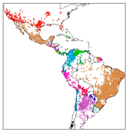 Triatomines are distributed throughout the Americas, from the southern United States to northern Argentina, presenting a gradual increase in species richness from the poles towards the equator [68]. One of the most up-to-date and comprehensive works on the distribution of triatomines based on presence records is that of Ceccarelli et al. [69] (Figure 7). However, due to the wild habitat of most species, there are still many unexplored areas, and it is likely that new species will remain to be described.