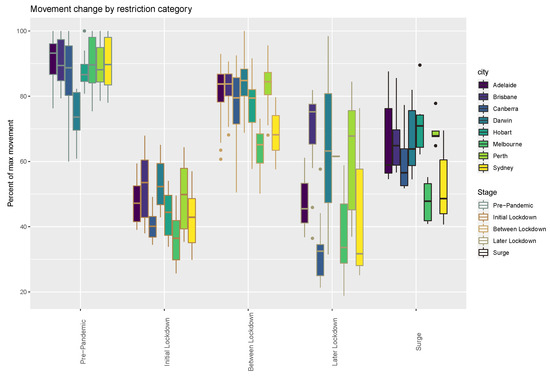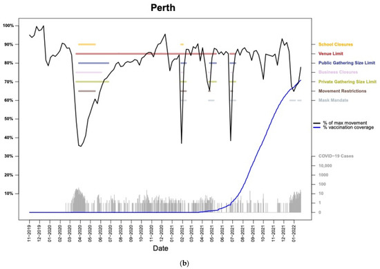 The chronology of restrictions for the Australian states and territories was collated from a mixture of media reporting and governmental publications. The resulting database contains the start and end dates for school closures, venue limits, public gathering size limits, business closures, private gathering size limits, movement restrictions, and mask mandates. Restrictions were issued primarily by state and territorial governments and those applicable only to regional areas outside the capital cities were omitted. The restrictions were categorized into five classes (Table 1) to group and analyze movement patterns associated with similar restrictions. The presence of movement restrictions or mandatory business closures, which were typically issued in tandem, were used to define lockdowns. The last category consists of a surge in cases coupled with few restrictions due to high vaccination rates. The start of the city-specific surge periods was defined as the week after October 2021 when each state first set a record for minimum, mean, or maximum daily cases. Note that the transition week of 16–22 March in 2020 was excluded as this week straddled the extremes of the pre-pandemic baseline and the start of the initial lockdown. The SARS-CoV-2 case data and vaccination rates were downloaded from www.covid19data.com.au (accessed on 9 July 2023). All cases, including those identified in quarantined travelers, were included in this analysis to avoid confusion related to inconsistent definitions in the reported data among the states and territories. Vaccination coverage was defined as two doses with an approved vaccine and the percentage was relative to the total population, including young children who were ineligible for vaccination as of January 2022.