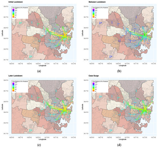 Movement maps for Sydney during pandemic stages relative to a pre-pandemic baseline for (a) the initial lockdown period, (b) periods without movement restrictions, (c) later lockdowns, and (d) surges in cases within a highly vaccinated population. For interpretability, only flows that were within the top 1% of flow volume on any week within the timeseries are mapped. Flows depicted with points rather than lines are indicative of movements within the 2 km pixels. Maps for all eight cities are presented in Figure S2 of the Supplementary Information.