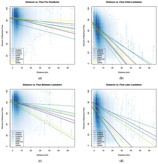 The unprecedented coincidence of a global pandemic and the existence of vast datasets enumerating human movement led to a proliferation of research studies exploring how travel patterns were affected by COVID-19 [5], as well as the development of novel tools to visualize and summarize these large movement datasets [6]. Numerous metrics have been used to assess COVID-19-related impacts on people’s lives, including analyses of nation-wide and/or sector-specific mobility during the pandemic [7,8,9,10,11]. Several studies also collected survey data and used them to associate characteristics or opinions of individuals with observed trends in aggregated human mobility data [12,13,14,15,16,17]. A number of human movement studies have focused on Australia [7,8,9,11,14,18], while other publications have had a focus on human mobility in cities elsewhere [15,17,19,20]. None, however, have yet explored high-resolution patterns of movement within Australian cities, particularly within the context of varying governmental restrictions.