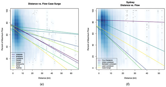 Linear trends in human movement flow volume by city for each COVID-restriction type shown on density plots (in blue) that illustrate the frequency of observed movements in each distance category. The inverse relationship between distance and flow volume is present in all stages (a–e), but more pronounced when harsher restrictions were implemented. Variability among cities may reflect features of the lockdowns such as limits on distance traveled from home and/or unique traits in cities and their populations. Panel (f) is a counter example of all lockdown categories for a single city (Sydney). Comparable plots for other cities are available in Figure S3 of the Supplementary Information.
