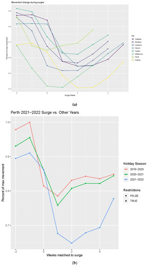 The following supporting information can be downloaded at: https://www.mdpi.com/article/10.3390/tropicalmed8070363/s1. Figure S1. The movement, restrictions, vaccinations, and incidence chronology for all state and territorial capitals in Australia. The black line represents movement within the city relative to the most movement observed within the timeseries. Cases are presented as in gray and displayed on a logarithmic scale. Figure S2. Movement maps for cities during pandemic stages relative to a pre-pandemic baseline for (a) The initial lockdown period, (b) Periods without movement restrictions, (c) Snap lockdowns, and (d) Surge in cases within a highly vaccinated popu-lation. For interpretability, only flows that were within the 1% of flow volume on any week within the timeseries are mapped. Figure S3. Declines in human movement flow volume by city for all lockdown categories for a single city. The lines represent the linear trends for all weeks within each category. Figure S4. Declines in human movement flow volume coincident with the late pandemic case surges amongst a heavily vac-cinated population and without restrictions compared to observed holiday movement volumes in other years. Anniversary weeks are aligned for each plot.