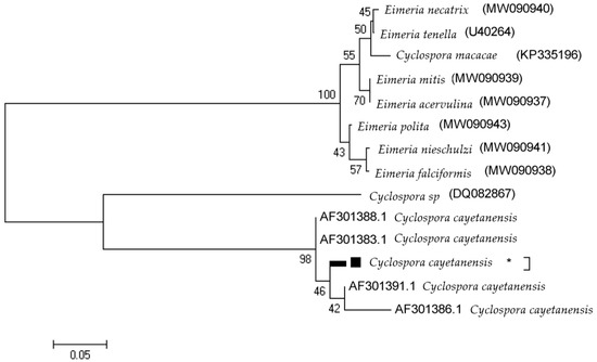 - Lalonde, L.F.; Gajadhar, A.A. Highly sensitive and specific PCR assay for reliable detection of Cyclospora cayetanensis oocysts. Appl. Environ. Microbiol. 2008, 74, 4354–4358. [Google Scholar] [CrossRef]