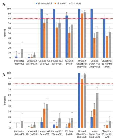 Induced mortality by IG2 and Olyset Plus LLINs in a cone bioassay against susceptible Kisumu (A) and resistant Muleba-Kis strain (B) of An. gambiae s.s. 0× = unwashed, 20× = 20 times washed in laboratory, and 36 m = 36-month-old net retrieved from community. n=total number of mosquitoes in each trial arm. Error bars represent 95% Wilson confidence intervals. Red dashed line is WHO 80% mortality threshold.