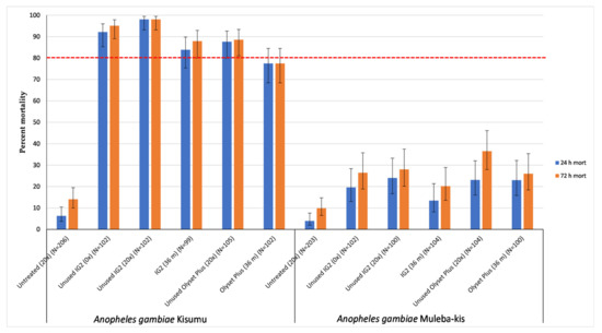With respect to mortality at 24 h post exposure, mortality was 71.3%, 61.3%, and 51.3% for new unwashed, 20-times-washed, and 36-month-old samples from field use, respectively. However, with respect to mortality at 72 h post exposure, only the unwashed IG2 was able to induce a mortality of 81.3% (reaching the WHO cut off of ≥80%), which decreased to 71.3% when washed 20 times, and was 67.5% for the 36-month-old net collected from the community.