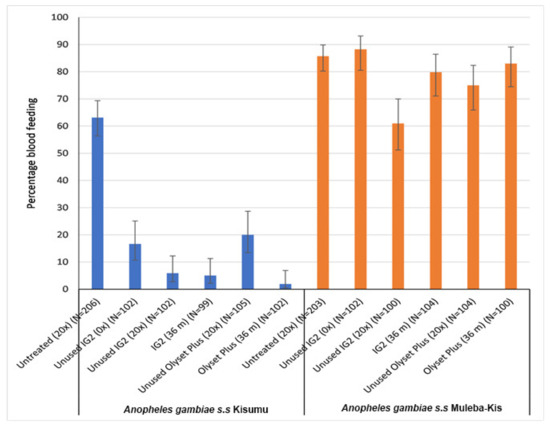 All treatments significantly reduced the blood feeding relative to the untreated control, against the susceptible Kisumu strain, but not against resistant (Muleba-Kis) mosquito strains.