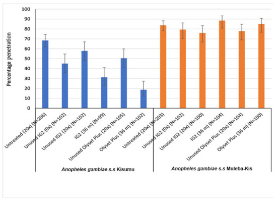 With the exception of the IG2 samples washed 20 times, all treatments significantly reduced the percentage of penetration relative to the untreated control (68.4%) against the susceptible Kisumu strain, but presented a non-significant difference against the resistant (Muleba-Kis) mosquito strain.