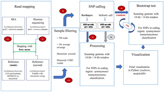 Nuclear genomes of L. donovani LV9 (TriTrypDB, release 62 [26]) and L. major Friedlin (TriTrypDB release 58) were used as references for variant calling. GenBank accession MN904518 and a contig from genome assembly of the strain Friedlin were used as maxicircle references for L. donovani and L. major, respectively. Sequencing reads were downloaded from SRA with ‘fastq-dump’, and quality control was performed with FastQC v. 6 [27] and MultiQC v. 1.14 [28] tools. Read trimming for adapter sequences and base quality analysis at 3’ ends were performed with Trimmomatic v. 0.32 [29] in the paired-end mode, with minimal retained read length set to 75 bp. Read pairs were mapped onto respective references with Burrows–Wheeler Aligner v. 0.7.17 [30]. Alignment files were processed with SAMtools v. 1.17 [31,32]. Sequencing read libraries were retained for further analysis if they met all the following quality criteria: average maxicircle and nuclear genome coverage over 10×, at least 5 million reads mapped onto the reference genome, at least 25,000 reads containing the CSB3 (Conserved Sequence Block 3) sequence present on minicircles [33], and no coverage gaps of size over 10,000 bp. Those not meeting the criteria were discarded (Figure 1).