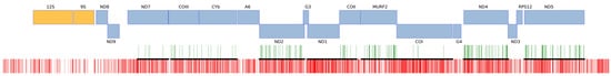 Distribution of SNPs over the L. donovani maxicircle CR. (Top) Map of L. donovani CR. The top and bottom boxes indicate genes encoded on different strands. Color indications for different types of genes: rRNA, orange; unedited genes and cryptogenes, blue. (Bottom) The red track shows the positions of all SNPs detected in 49 strains collectively. The green track shows the positions of non-synonymous SNPs (in locations where such a determination was possible). The black segments between tracks indicate maxicircle regions where the determination of synonymous or non-synonymous SNPs can be made. Namely, these are locations where ORFs can be deduced from the maxicircle sequence either because an entire mRNA is properly encoded or else a cryptogene possesses regions that are properly encoded and do not require editing.