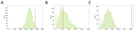 Distribution of nuclear genome SNPs per 18 kb window. Number of SNPs per window is given on the X axis, number of windows with that SNP count is given on Y axis. (A) For all SNPs; (B) for non-synonymous SNPs (including nonsense); (C) for synonymous SNPs. On all histograms, the red vertical line indicates the respective value for the kinetoplast maxicircle CR.