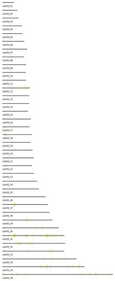 As can be surmised by Figure 3A, there is variability in the number of SNPs in different nuclear genomic regions. To determine where genomic regions with high nucleotide substitution rates are positioned in the Leishmania nuclear genome, we generated chromosome maps on which we plotted the 18 kb genomic windows with total SNP numbers higher than that of maxicircle CRs (Figure 4). These highly variable regions are distributed on the chromosomes in a non-random fashion. Some chromosomes were free of these regions, and others were densely covered. For example, genetically variable regions occupy almost 30% of Chromosome 31. This chromosome is tetra(poly)-somic in most (if not all) Leishmania spp. analyzed and is likely involved in recombination processes [55,56,57]. In contrast, we found no direct connection between high SNP-containing windows and chromosome telomeres, centromeres, or repeat-rich regions. The same analysis using the L. major genome as a reference resulted in similar distributions with just a few minor differences, most probably caused by fluctuations in window size selection (Figure S4).
