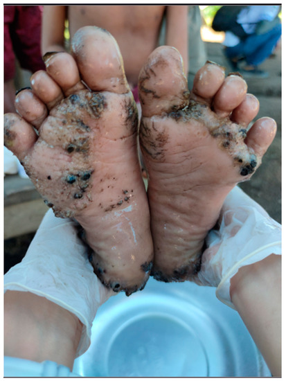 - Miller, H.; Ocampo, J.; Ayala, A.; Trujillo, J.; Feldmeier, H. Very Severe Tungiasis in Amerindians in the Amazon Lowland of Colombia: A Case Series. PLoS Negl. Trop. Dis. 2019, 13, e0007068. [Google Scholar] [CrossRef]