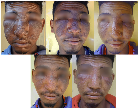 A patient with extensive mucocutaneous leishmaniasis: (A) Swollen, erythematous, and crusted plaques on the face which restricted opening of the eyelid. The patient rated his lesion as severe and had a DLQI score of 16. (B) Reduced swelling and crusting with flattening and darkening of the lesions after treatment cycle 1, with substantial improvement as the clinical outcome. DLQI score was 9 and patient-reported severity was moderate. (C) Further reduction in swelling and plaque formation, with substantial improvement as the clinical outcome after cycle 2. DLQI score 8 and patient assessment was mild. (D) Lesion was rated as cured with significant remaining scar tissue after cycle 3. Swelling around the eyes had almost completely gone. DLQI was 3 and the patient rated the lesion as mild. Treatment was not extended after the third cycle. (E) Worsening with increased swelling, erythema, and papules on both cheeks at D180. The patient rated his DLQI as 20, and his lesion as severe.
