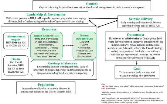 As indicated in Figure 1, the conceptual framework is adopted and modified by Olmen J. et al. to improve the EWR, including risk protection in Gujarat, India. To achieve this, there is a need for cross-sectoral collaborations at various levels, i.e., policy levels, institutional levels, and operational levels, for the timely collection of data, analysis, and communication. However, to understand the cross-sectoral collaborations from the HSPR perspective, resources, i.e., infrastructure and supplies, human resources, finance, and knowledge and information, are essential in addition to leadership and governance. This particular study focuses exclusively on the cross-sectoral collaborations across the human resources of the human and animal health surveillance system engaged at different levels (policy, institutional and operational).