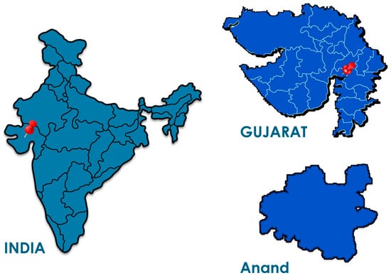 The study site indicating (left) Gujarat state in India, (right top) Anand district of Gujarat state and (right bottom) Anand district, Gujarat, India.