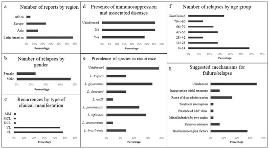 Chart with data collected from all articles classified as case reports. (a) The graph illustrates the number of case reports included in this study, segmented by geographical region. (b) The distribution of CR of leishmaniasis cases is presented, stratified by gender, as reported in the articles. (c) The graph displays the main types of clinical presentations of leishmaniasis that experienced clinical recurrences in the analyzed articles. (d) It demonstrates the presence of immunosuppression and associated diseases identified in the research participants. (e) The graph highlights the prevalence of different species of Leishmania spp. associated with CR, based on the species studied in each article. (f) It presents the relationship between CR and age groups, providing an overview of recurrence incidence across different age ranges. (g) The graph summarizes the mechanisms pointed out by the authors of the articles as responsible for TF/CR. CR: clinical relapse; TF: treatment failure; CL: cutaneous leishmaniasis; VL: visceral leishmaniasis; DCL: diffuse cutaneous leishmaniasis; MCL: mucocutaneous leishmaniasis; MM: multiple manifestations.