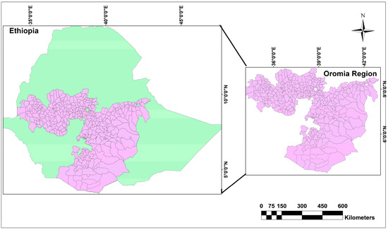 This study was conducted in the Oromia region of Ethiopia, one of the largest regions in the country by area with a total area of 0.2 million square kilometers (Figure 1). According to the most recent estimates, the population of the Oromia region was 40 million people in 2022 [11]. Climate conditions in the Oromia region are very diverse ranging from highland (cold), midland (temperate), and lowland (hot) areas. The climate in the region experiences four distinct seasons with hot and dry summers and mild and rainy winters. Average annual rainfall varies across the region. The districts are the lowest administrative divisions with legal autonomy.