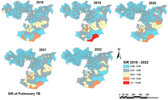 Standardized incidence ratio: Standardized incidence ratios (SIRs) were calculated for each district by year. For each district , = 1…n, the SIR was calculated as the ratio of the observed number of TB cases in the district () to the expected number of TB cases () in the district across the study period, t = 2018,…., 2022: