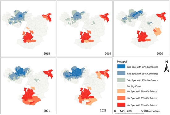 Based on our clustering analyses using the Getis–Ord Gi statistic, some districts were identified as hotspots and cold spots (Figure 3).