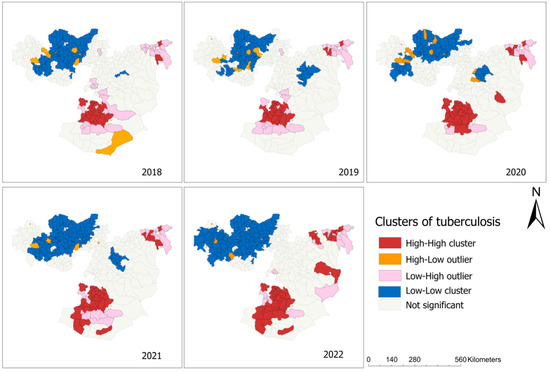 Densely populated districts were highly vulnerable to TB distribution. The spatiotemporal distribution of TB was positively associated with demographic factors. Accordingly, our present study revealed an association between TB notification and population density. This aligns with previous studies that consistently indicate a relatively higher prevalence of TB in areas characterized by higher population density, particularly in urban settings, when compared to less densely populated rural areas [10,25,26,27]. In areas with high population density, where overcrowded living conditions are common, there is an increased risk of TB transmission due to the proximity of individuals [28]. Moreover, the limited access to quality healthcare services and poor sanitation exacerbate the situation. The combination of these factors, along with a higher prevalence of HIV and other risk factors, contributes to the occurrence of high TB prevalence [4,10]. By addressing the unique challenges posed by population density, health authorities can work toward reducing the prevalence of TB in these areas and improving overall health outcomes.