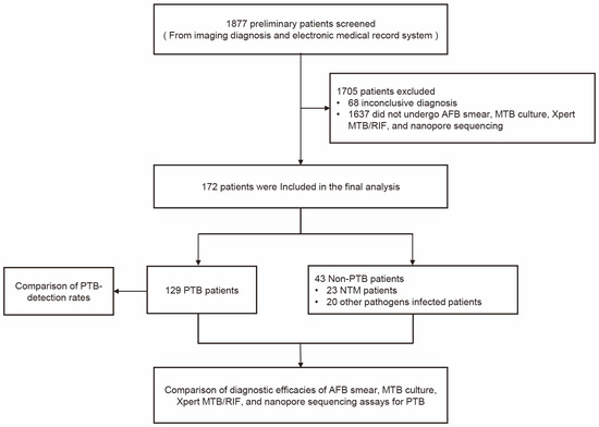 A total of 1877 individuals were initially screened for PTB using diagnostic imaging and electronic medical records. Subsequently, 1705 individuals with inconclusive diagnoses were excluded from testing via AFB smear, MTB culture, Xpert MTB/RIF, and nanopore sequencing assays and, thus, were not included in the final analysis. The remaining 172 patients (aged 10 to 82 years) were included in the final analysis of which 129 were diagnosed with PTB and 43 with non-PTB disorders. Ultimately, 23 of the non-PTB patients were found to be infected with NTM, while the remaining 20 were found to harbor infections caused by other pathogens (Figure 1). Each patient provided one specimen, resulting in the collection from all patients of 8 sputum specimens, 151 BALF specimens, and 13 pleural fluid specimens. No patients were infected with HIV. General patient data are presented in Table 1.