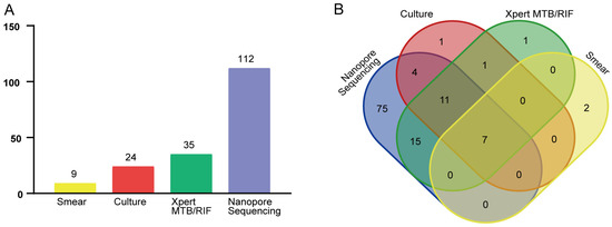 Positive PTB-detection rates obtained for smear, culture, Xpert MTB/RIF, and nanopore sequencing assays. (A) Number of samples yielding positive PTB-detection results for the four assays. (B) Venn diagram of MTB-positive results obtained for the four assays.