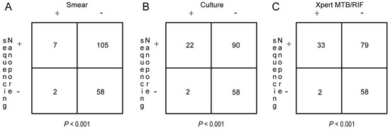 Pairwise comparisons between PTB-detection rates of nanopore sequencing and corresponding rates obtained using the other three methods (McNemar’s test). (A) Comparison of PTB-detection rates between nanopore sequencing and AFB smear assays. (B) Comparison of PTB-detection rates between nanopore sequencing and MTB culture assays. (C) Comparison of PTB-detection rates between nanopore sequencing and Xpert MTB/RIF.