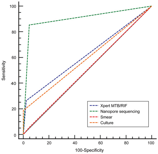 The sensitivity rate, specificity rate, positive predictive value (PPV), and negative predictive value (NPV) obtained via AFB smear were 5.4%, 95.3%, 77.8%, and 25.2%, respectively, as compared to the respective values obtained via culture (18.6%, 100.0%, 100.0%, and 29.1%), Xpert MTB/RIF (26.4%, 97.7%, 97.1%, and 30.7%), and nanopore sequencing (85.3%, 95.4%, 98.2%, and 68.3%) with results shown in Table 3. The generation of ROC curves for further analysis (Figure 4) enabled comparisons of the ROC curve AUC values for nanopore sequencing to the corresponding values obtained for the other three tests (DeLong test). The AUC values obtained via nanopore sequencing were significantly higher than the AUC values obtained via smear (0.903 vs. 0.504, p < 0.001), culture (0.903 vs. 0.593, p < 0.001), and GeneXpert MTB/RIF (0.903 vs. 0.620, p < 0.001).
