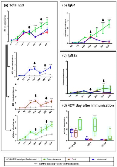 Kinetics of the rK39-HFBI-specific IgG, IgG1, and IgG2a production in BALB/c mice immunized by the intranasal, oral, and subcutaneous routes measured by ELISA. (a) IgG production of the three immunized groups, compared between each other (grouped graph) or against the control extract (individual graphs). (b) IgG1 and (c) IgG2a production elicited by the three immunization routes. (d) IgG, IgG1, and IgG2a production of all three groups at the time of the challenge with the parasite (42nd day). A serum dilution of 1:1000 was used. The antigen was semi-purified rK39-HFBI (blue, red, and green graphs) or semi-purified control plant extract (gray graphs). Arrows indicate the days of the booster doses. Mean ± SEM of each group is plotted. There was no statistically significant difference between the intranasal and oral groups in any analysis. The letters indicate statistical significance against all the other groups in the same graph and at the indicated time point (two-way ANOVA with Bonferroni post-test): * (p ≤ 0.05), ** (p < 0.01), *** (p < 0.001), and **** (p < 0.0001).