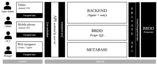 The main advantage of the adopted design resides in the lack of sensitive data stored in the end user device, which forces the requirement of internet connection to be able to send and receive information from the backend server. For simplicity, we will not go into technical details of the implemented securitization, but overall it is done using certificates and cryptographic tokens to ensure confidentiality and avoid eavesdropping while preventing unauthorized users from accessing the system. In addition, sensitive data is stored in an encrypted database, which can only be accessed through a private API that cannot be directly reached from the internet.