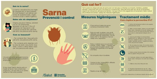 - Barrabeig, I.; Gassiot, M.; Gómez-de-Carvallo, M.; Maresma, M.M.; Molinero, E.; Parron, I. Protocol de Prevenció i Control de l’Escabiosi (Sarna); Agència de Salut Pública de Catalunya: Barcelona, Spain, 2019; Available online: https://hdl.handle.net/11351/4203 (accessed on 10 September 2023).