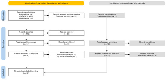 The 33 studies included in the analyses, all of them published from 2007 to 2022, are summarized in Table 1 [13,14,21,22,23,24,25,38,39,40,41,42,43,44,45,46,47,48,49,50,51,52,53,54,55,56,57,58,59,60,61]. Among them, 17 (51.51%) were published after 2014, when the WHO first identified CCHF as a global health threat [20]. All studies were based on enzyme-linked immunoassay (ELISA) and included a total of 20,195 samples: 13,197 (65.35%) were associated with occupational groups, while 6698 samples were considered from the general population (34.65%).