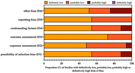 Summary of the risk of bias assessment according to the National Toxicology Program’s (NTP) Office of Health Assessment and Translation (OHAT) handbook and the respective risk of bias (ROB) tool [17,18].