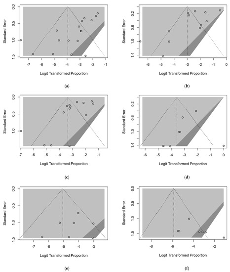 Border-enhanced funnel plots for occupational groups included in the meta-analysis: (a) abattoir workers, (b) animal handlers, (c) farmers, (d) rangers/hunters, (e) healthcare workers (HCWs), and (f) veterinarians.