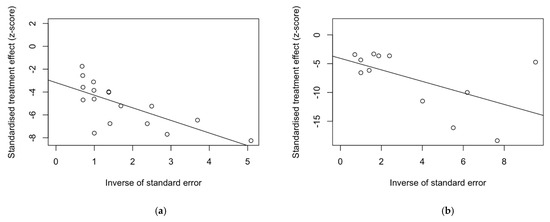 Potential publication bias is assessed in Figure 3 by analysis of funnel plots. Funnel plots are a graphical representation of the sample size, or an index of precision (Y-axis) plotted against the effect size they report (X-axis) [30].