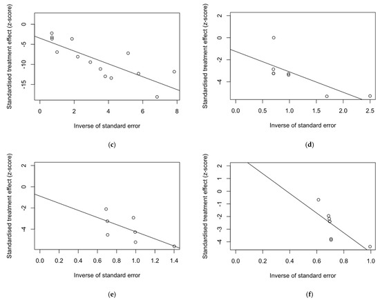Radial plots were calculated in order to ascertain the small study bias, and the corresponding graphs are reported in Figure 4. According to Galbraith [30,32], radial plots are produced by first calculating the standardized estimates or z-statistics by dividing each estimate by its standard error (SE), then scatter plotting each z-statistic (Y-axis) against 1/SE (X-axis). On the one hand, it is expected that larger studies (characterized by a smaller SE and a larger 1/SE) will be observed to aggregate away from the origin. On the other hand, small study bias is usually ruled out by even plotting of estimates along the regression line. Visual inspection suggested that small study bias can be reasonably ruled out among abattoir workers (Figure 4a), animal handlers (Figure 4b), and HCWs (Figure 4e), while it reasonably affected all other estimates.