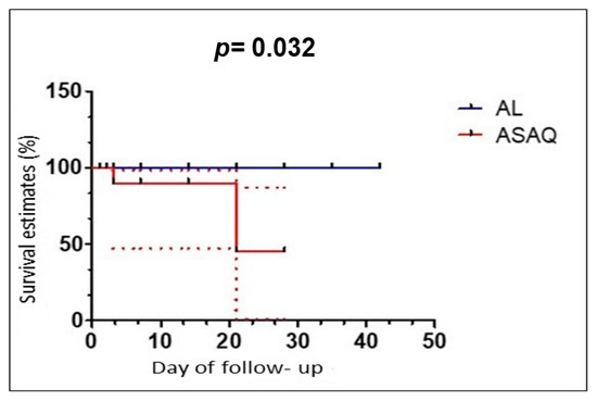 Figure 2 shows the Kaplan-Meier curve of the cumulative treatment success over the 42-day follow-up period, after PCR correction. The follow-up rate of the patients treated with AL was 100% compared to 46.1% for the group treated with ASAQ at 42 days. There was a statistically significant difference between the follow-up rate and the drugs used (p = 0.032) (Figure 2).