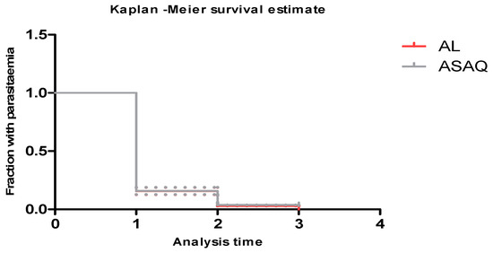 Almost all sub-Saharan African countries recommend either AL or ASAQ for the treatment of uncomplicated malaria [2]; hence, the emergence of artemisinin resistance in some countries is a matter of great concern [27,28]. Therefore, it is essential to monitor the effectiveness of the ACTs [2]. Most of these recurrent parasitemia samples are reclassified as reinfections based on PCR genotyping, especially with the AL. Furthermore, Kaplan–Meier curve analysis showed a significant difference between the two groups after PCR, indicating a lower recrudescence level in the AL group from 2012 to 2013. However, after aggregating the 2009–2016 data, there was no significant difference between the data.