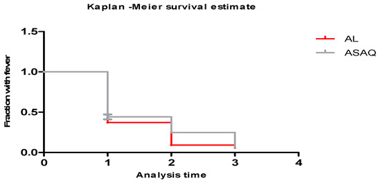The clearance times and fever clearance were comparable between the two study arms (Figure 3 and Figure 4). Both treatments produced a rapid clearance of parasites (Figure 3) on day two at 99% for the ASAQ and AL groups. On day three, the parasite clearance rate was 100% in both groups (Figure 3). The fever clearance was observed on day two after the first dose treatment (Figure 4).