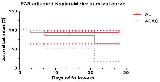 Figure 5 shows the Kaplan-Meier curve of the cumulative treatment success over the 28-day follow-up period after PCR correction. The follow-up rate of the patients treated with AL was 94% compared to 64% for the group treated by ASAQ at 28 days. There was no statistically significant difference between the follow-up rate and the medical devices used (p = 0.3) (Figure 5).