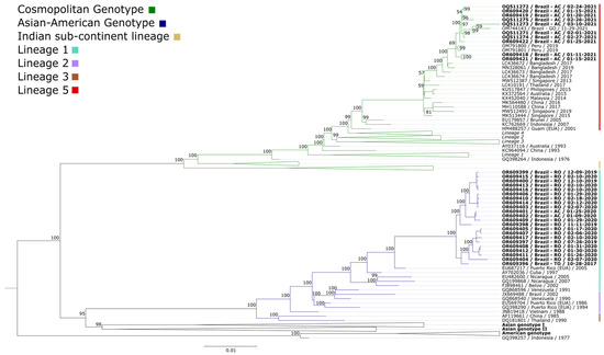 Our findings reinforce what we proposed in our partial report regarding the introduction of a new genotype, raise awareness about its dissemination, and provide insights into the cocirculation of multiple lineages in the Americas [56]. Although a phylogenetic relationship was observed between the only case of the cosmopolitan genotype in the Midwest region of Brazil and the cases described in Madre de Dios, Peru [45,46], no geographical linkage has been established between these regions that do not share borders [46,47,48].