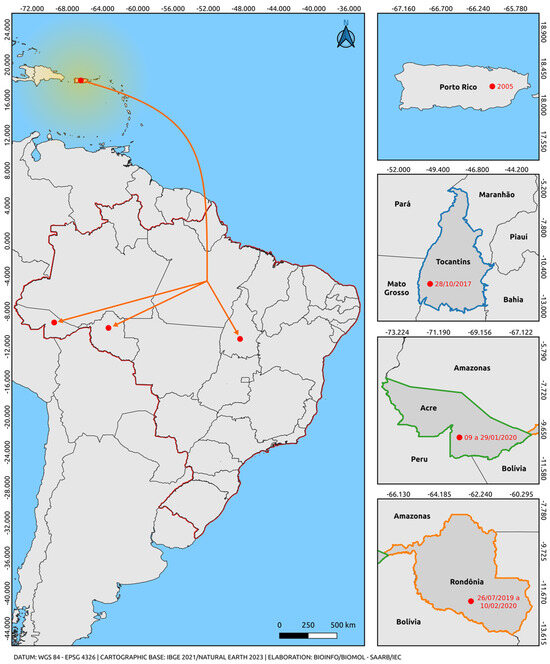 Map illustrating the possible route of introduction and dispersal of the Asian-American genotype of DENV-2 suggested by this study. The orange arrow indicates parallel dispersion from Puerto Rico through an unmapped route (Puerto Rico-Brazil/Tocantins, Acre, and Rondônia). The bifurcation region indicates only the intersection corresponding to parallel dispersion for the states of Acre, Tocantins, and Rondônia, not that the dispersion route necessarily includes the state in which the bifurcation region is located. In other words, the strains recorded in Brazilian states prior to 2020 likely originated from Puerto Rico. The colors delineate the states and the intersections between the regions of the countries (Blue: Tocantins, Brazil; Green: Acre, Brazil; Orange: Rondônia, Brazil; Red: border region with Brazilian states). The yellow gradient circle indicates potential strain dispersion routes to regions in the Americas and neighboring countries, originating from Puerto Rico as a secondary dissemination center. The map was created using QGIS software v.3.28, available at https://qgis.org/pt_BR/site/ (accessed on 9 June 2023).