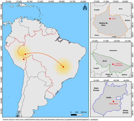Ten sequences obtained in this study clustered within a well-supported South American clade, supported by high bootstrap values, including two Peruvian sequences and the only sequence previously described in Brazil. Our previous report revealed the first evidence of the cosmopolitan genotype in the northern region of Brazil during a DENV-2 outbreak in the state of Acre, northern region, in early 2021, months before the single detection case in Goiás [46,56]. Samples in this study were collected between January and March 2021, demonstrating the circulation of this genotype prior to the reported case in Goiás. Phylogenetic inference also revealed that the South American clade was positioned among sequences belonging to lineage 5 of the genotype. These cases establish a closer geographic connection between findings in Peru and the central-west region of Brazil, providing insights into the most likely route of introduction of this genotype into Brazil from the border with Peru in the Madre de Dios Region (Figure 3).