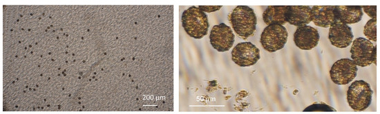 Figure 2. Eggs of Ascaris lumbricoides detected in the LOD technique (left), a magnified image of Ascaris lumbricoides eggs (right).
