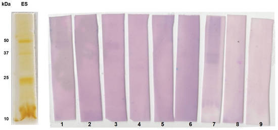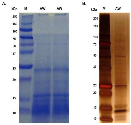 The majority of proteins in both the AW and ES extracts fell within the molecular mass range of 10 kDa to 50 kDa, with faint bands above 50 kDa in the AW extract (Figure 1; Figure 2). Prominent protein bands were observed in both extracts, with a cluster around 20–25 kDa and faints bands near 37 kDa observed in the SDS-PAGE gels.