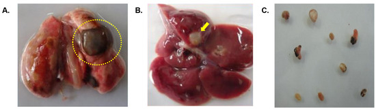 (A) Infected lung of a Wistar rat with cysts (dotted circle) containing adult P. westermani type 1 lung flukes. (B) Cysts formed in liver of Wistar rats due to Paragonimus infection indicated by arrow. (C) Adult lung fluke worms in 1X PBS.