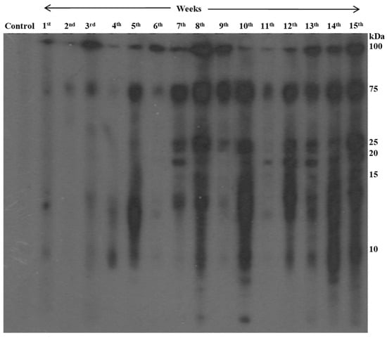 Immunoblotting was performed using sera from infected rats collected over time. At first, the AW protein sample was resolved in 15% Tris-Glycine SDS-PAGE gels procured from Bio-Rad (Hercules, CA, USA). The electrotransfer of proteins from the gel to the polyvinylidene difluoride membrane (PVDF) was performed in a Bio-Rad Trans-Blot transfer cell for 90 min at 100 V. Next, the blotted membrane was incubated with blocking buffer containing 5% BSA in wash buffer (0.1% Tween20 in Tris-NaCl; TBST) for 1 h. The blotted PVDF was cut into vertical strips and stored overnight with sera collected weekly from infected rats. The rat sera were diluted in the ratio 1:100 with blocking buffer. An uninfected rat serum was taken as negative control group. Next, the membrane strips were washed in TBST and incubated in a solution containing the secondary antibody (dilution ratio 1:2500) HRP-conjugated anti-rat IgG (Promega Corporation, Madison, WI, USA). The membrane strips were then washed with TBST and the antibody–antigen reaction was observed using the Promega TMB (3,3′,5,5′-tetramethylbenzidine)chromogenic substrate.